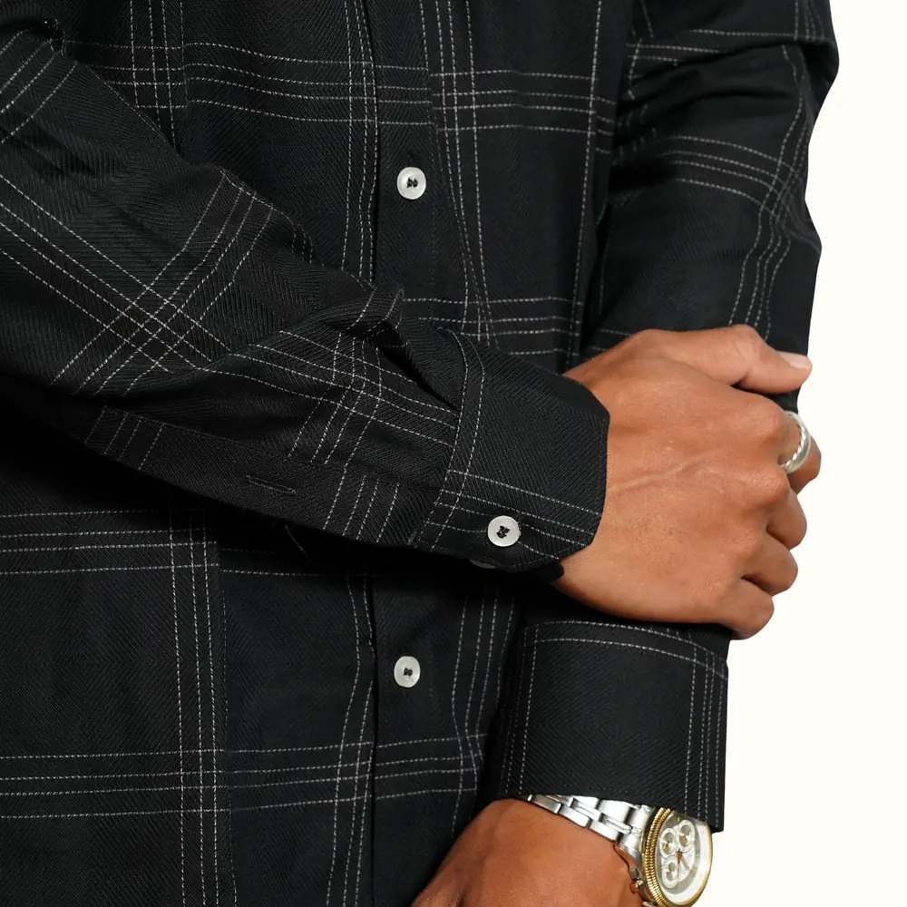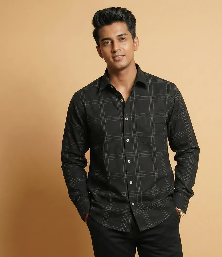 A versatile casual shirt crafted from pure cotton, featuring a deep black base with subtle windowpane checks. Designed in a comfortable regular fit, it’s lightweight, breathable, and ideal for effortless everyday wear.
